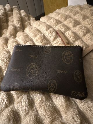 Elegante monedero de la marca Don Algodón. - Diseño en color negro. - Cierre completo con cremallera. - Detalle de logo circular en relieve en la parte frontal. - Incluye asa lateral con cordón y detalle metálico. Se vende porque los reyes me han traído uno nuevo.