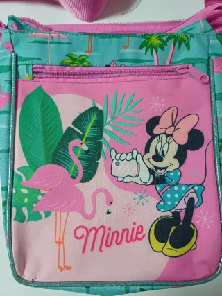 Adorable conjunto de bolso y monedero con diseño de Minnie Mouse y flamencos. - Bolso con estampado tropical y Minnie Mouse. - Monedero a juego con diseño de Minnie Mouse. - Tira de hombro ajustable en color rosa.