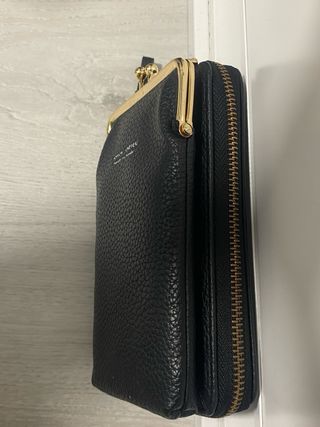 Práctico monedero con un diseño funcional y elegante. - Múltiples compartimentos para organizar tus tarjetas y dinero. - Cierre de cremallera seguro. - Detalle de correa con broche.
