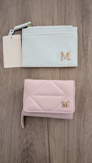 Conjunto de tarjetero y monedero con detalle de inicial. - Tarjetero con textura y cremallera. - Monedero acolchado con solapa. - Diseño con inicial 'M' en dorado.