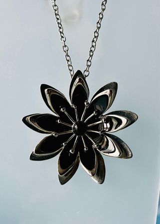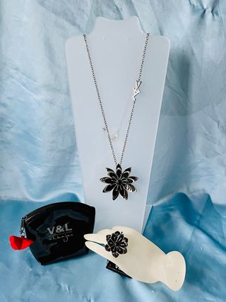 Conjunto de joyería Vitorio & Luchino. - Collar con colgante de flor. - Anillo (19 mm) a juego con diseño de flor. - Incluye un pequeño monedero negro con cremallera y detalle de flor roja. No es nuevo, poco uso