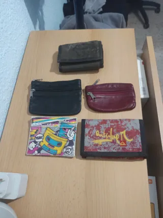 Conjunto de cuatro carteras y monederos. Se pueden vender sueltas o el lote completo. - Una cartera de color marrón desgastado. - Un monedero negro con cremallera. - Un monedero granate con cremallera. - Una cartera con diseño de cassette y texto YEAH! y LET'S GO!. - Una cartera con diseño de salpicaduras en rojo y gris y logo de Quiksilver.