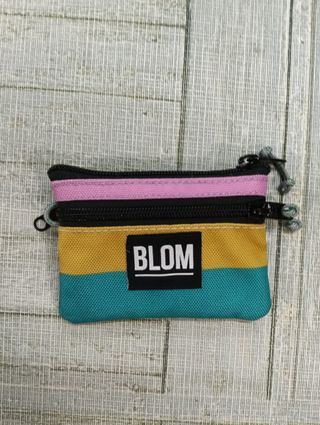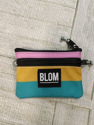 Monedero pequeño con tres bolsillos y cierre de cremallera (todas en perfecto estado) de la marca española BLOM. Material resistente y de calidad. Estampado delantero con franjas horizontales en colores pastel: rosa, amarillo y azul. Color negro en la parte trasera. Muy buen estado.