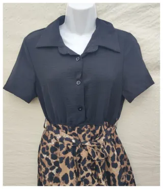 Vestido de corte camisero con estampado de leopardo y cinturón. - Mangas cortas. - Falda con vuelo y volante. - Combina negro y marrón.