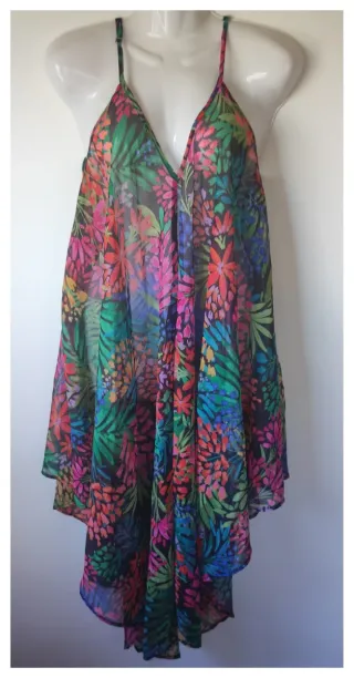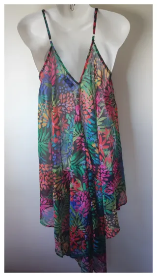 Vestido playero con un vibrante estampado floral, perfecto para lucir en la playa o piscina. Su diseño ligero y vaporoso lo hace muy cómodo. - Diseño con tirantes finos. - Escote en V pronunciado. - Bajo asimétrico con vuelo.