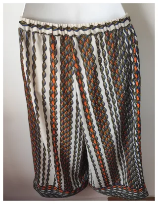 Pantalón hasta la pantorrilla con un llamativo estampado. - Diseño con cadenas entrelazadas en tonos naranja, azul y dorado. - Cintura elástica para mayor comodidad. - Bajo con borde decorativo.