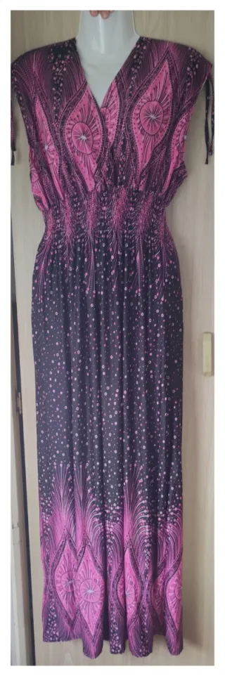 Vestido largo con un llamativo estampado. - Diseño con escote en V. - Cintura elástica fruncida. - Mangas cortas. - Largo hasta los tobillos.