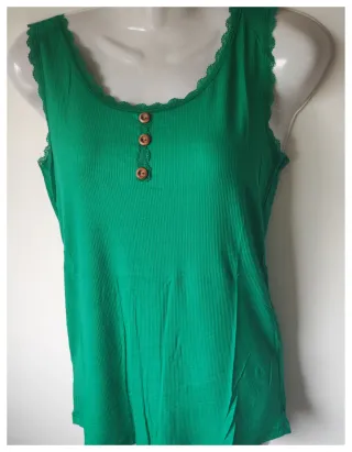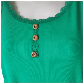 Camiseta de tirantes verde con detalle de encaje y botones de madera. - Cuello redondo con borde de encaje. - Tres botones de madera en la parte delantera. - Tejido acanalado.