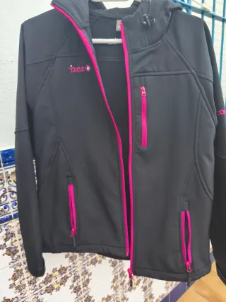 Chaqueta deportiva Izas en color negro con detalles en rosa. - Cremallera frontal. - Bolsillos con cremallera. - Capucha.