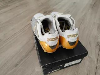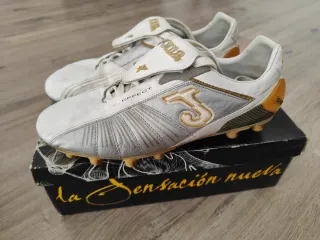 Botas de fútbol Joma de piel con un diseño moderno y llamativo. - Combinación de colores plata y blanco. - Detalle del logo Joma en dorado. - Suela con tacos para césped.