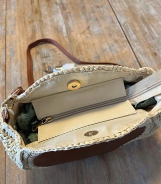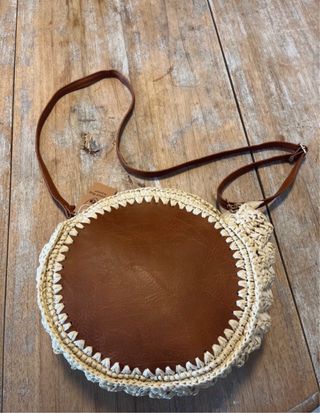 Bolso redondo con un diseño de rafia y detalles en piel. - Material exterior de rafia. - Panel frontal en contraste marrón - Correa ajustable. - 24 cm de diámetro y 11 cm de ancho