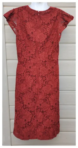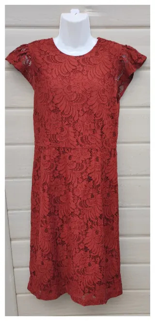 Vestido de encaje con un bonito color teja. Ideal para lucir elegante. - Diseño de encaje floral. - Manga corta abullonada. - Corte a la cintura.