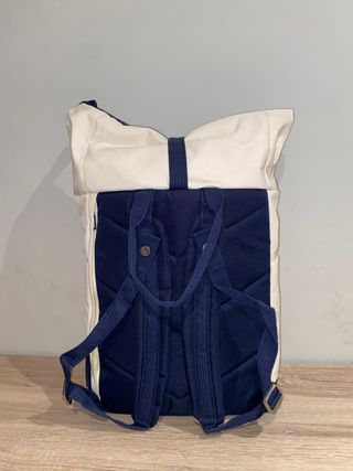 Mochila enrollable de la marca Milan, modelo 1918 Series. Diseño moderno y práctico. - Color blanco con detalles en azul marino. - Cierre superior enrollable con hebilla. - Bolsillo frontal con cremallera. - Asas de hombro ajustables.