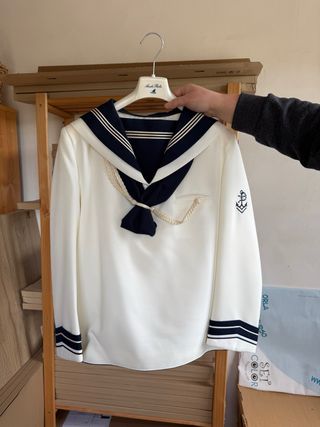 Traje de estilo marinero, ideal para comuniones. Presenta un diseño clásico con detalles náuticos. - Cuello marinero con ribetes. - Lazada decorativa. - Ancla bordada en la manga. El traje está para lavar los camales de las piernas, por lo demás está completamente nuevo.