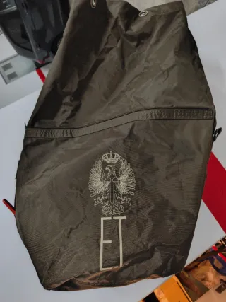 Petate militar de gran capacidad, ideal para equipamiento o viajes. - Diseño con cierre de cremallera. - Incluye un emblema con un águila coronada y las iniciales ET. - Ejército de Tierra español. Se encuentra nuevo sin estrenar