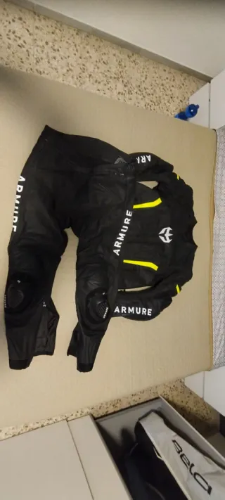 Mono de moto de dos piezas de la marca Armure. Diseñado para ofrecer protección y comodidad en la carretera. - Chaqueta y pantalón de cuero. - Detalles en color amarillo. - Cierre de cremallera frontal. Talla chaqueta: M Talla pantalón: S (aunque para M te puede ir bien) Usado pocas veces de ruta