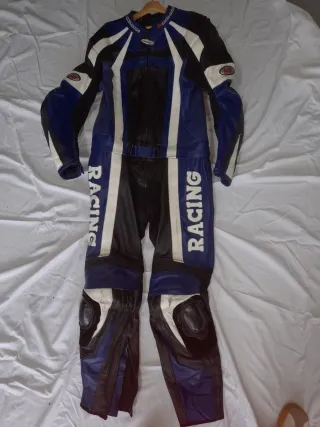 Mono de cuero para motociclismo en llamativos tonos azul y blanco. Diseñado para ofrecer protección y estilo en la carretera. - Diseño con inserciones blancas y azules. - Detalle de texto RACING en las piernas. - Protecciones integradas .