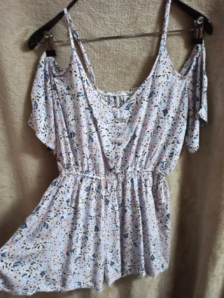 Mono corto de mujer con estampado floral y detalles en azul y blanco. Tiene un elástico en la cintura para un mejor ajuste y tirantes finos con hombros descubiertos. - Diseño con estampado de flores y puntos. - Cintura elástica. - Tirantes finos. - Mangas cortas con hombros descubiertos.