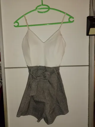 Mono de verano con diseño bicolor. - Parte superior blanca con detalles negros. - Pantalón negro. - Tirantes finos. Muy cómodo y elegante