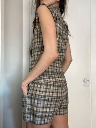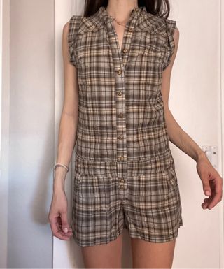 Mono corto con estampado de cuadros. - Diseño sin mangas. - Cuello camisero. - Cierre de botones. - Bolsillos delanteros.