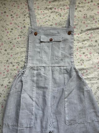 Mono corto de verano con un diseño de rayas verticales. - Tirantes con lazada. - Cierre de botones en la parte delantera. - Bolsillos laterales.