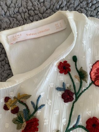 Mono blanco de Zara con un bonito bordado floral en la parte superior. Ideal para el verano. - Diseño con mangas cortas. - Tejido ligero con pequeños topos. - Abertura en la espalda.