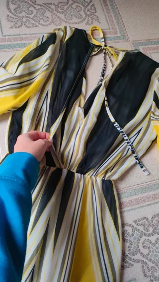 Mono corto estampado S / 36 / 8·Muy bueno·Local 6,00 € MarcaLocal Tamaño S / 36 / 8 Estado Muy bueno Color Amarillo, Negro Subido hace 2 semanas Mono corto con estampado geométrico en tonos amarillo, negro y blanco, muy llamativo y favorecedor. Escote en pico cruzado que estiliza el torso y cintura elástica que marca la silueta sin apretar. Manga 3/4 fluida y tejido ligero, ideal para primavera y verano. Diseño elegante pero con personalidad, perfecto tanto para eventos informales como para salir arreglada sin complicaciones. El contraste de colores lo hace muy vistoso y fácil de combinar con sandalias negras, cuñas o bolso neutr