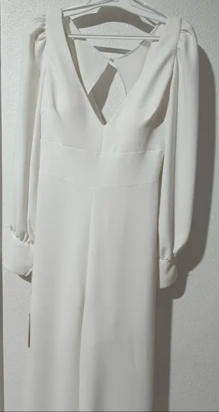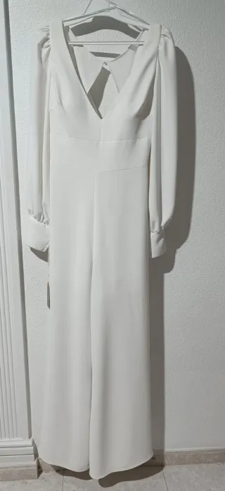 Elegante mono largo de color blanco natural ,ideal para eventos especiales o como opción nupcial. - Diseño con escote pronunciado en V. - Mangas largas abullonadas con puños y botones. - Espalda a caja con abertura y detalle de botones en fajín - Cintura marcada. - Piernas amplias con abertura en un lateral