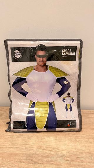 Disfraz de Space Samurai inspirado en Vegeta, perfecto para cosplay o fiestas temáticas. Talla L - Incluye mono, armadura de hombros, botas. - Diseño detallado con colores azul, blanco y amarillo.