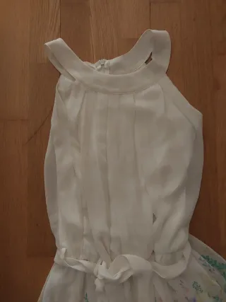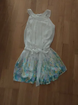 Mono corto de gasa para niña con un diseño alegre y veraniego. La parte superior es blanca y la parte inferior presenta un estampado floral multicolor. Todo forrado. Talla 14 años. - Tirantes finos. - Cintura elástica con lazada. - Tejido ligero y vaporoso.