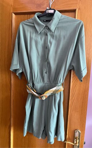 Mono corto de Zara con cinturón de tela trenzada. - Manga corta - Cuello camisero - Cierre de botones - Cinturón con hebilla de madera - Usado dos veces