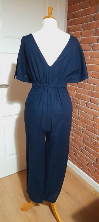 Mono largo de Zara en color azul marino y tejido imitación lino. - Escote en V. - Cintura elástica. - Mangas cortas tipo mariposa. - Piernas anchas. - Muy favorecedor.