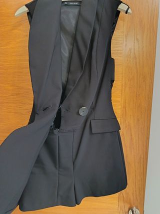 Elegante mono negro de Zara. - Diseño sin mangas. - Solapa ancha. - Cierre de un botón. - Bolsillos frontales.