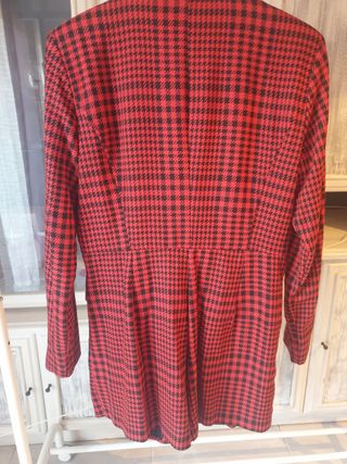 Vestido mono de la marca Zara con un estampado de pata de gallo en rojo y negro. Tiene un corte elegante y moderno. - Estampado pata de gallo. - Cierre de botón. - Bolsillos frontales.