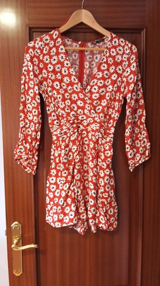 Mono corto de Zara con un alegre estampado de flores sobre fondo teja. Presenta un diseño cruzado en la parte delantera y mangas tres cuartos. - Diseño cruzado. - Mangas tres cuartos. - Estampado floral. - Cremallera en la espalda - Goma fruncida detrás