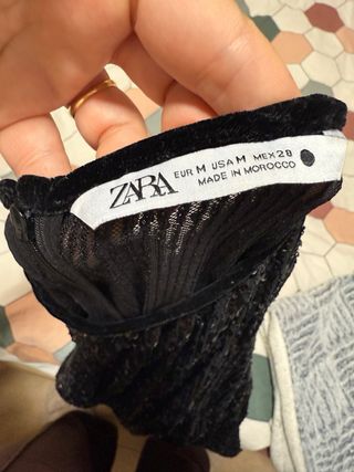 Mono elegante de Zara, perfecto para eventos especiales. Combina tonos negros y azules oscuros. - Diseño con encaje en los hombros. - Espalda descubierta. - Corte favorecedor.