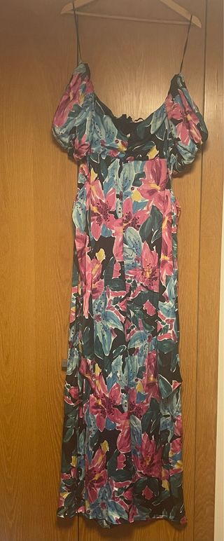 Precioso mono de Zara con un estampado vibrante. - Diseño con escote Bardot. - Mangas abullonadas. - Tejido ligero y fluido. - Cremallera escondida. Para eventos, boda, fiesta