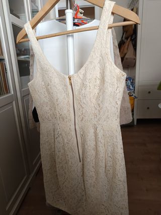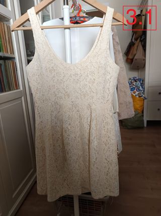 3. Trajes: un solo uso o nuevo. Precio 10€ 3.1. Traje corto de encaje, talla M, h&m, color crema, un solo uso. 3.2. Mono, talla M, color grisáceo, un solo uso. 3.3. Traje corto, Zara Basic, talla M, negro encaje, un uso, forrado.