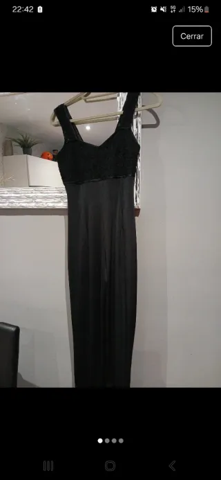 Conjunto de dos trajes de fiesta. - Mono negro con top adornado con pedrería dorada, tejido elástico y pantalón con bolsillos. - Vestido negro de manga larga con flecos en donde empieza la manga ( hombros ) y donde termina la manga, tejido de símil ante uno por 20 y los dos X 35€.