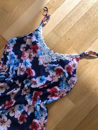 Precioso mono corto de la marca Trafaluc, talla S. Es de color azul marino con estampado floral multicolor. Tiene un diseño alegre y favorecedor. - Escote redondo. - Sin mangas. - Corte a la cintura.