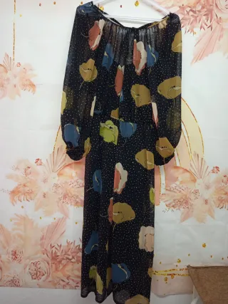 Mono tipo vestido corto de esta temporada de mujer con estampado floral vibrante. Una prenda llamativa y versátil,una puesta -talla L -Bolsillos laterales. - Diseño de manga larga. - Estampado de flores pequeñas en múltiples colores sobre fondo negro.