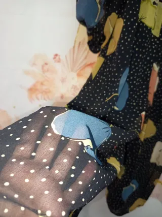 Mono largo de Zara con un bonito estampado floral sobre fondo negro y pequeños topos blancos. El tejido es ligero y vaporoso, ideal para cualquier ocasión. - Mangas largas abullonadas. - Escote pronunciado en pico con lazada. - Cintura elástica. - Estampado de flores en tonos verdes, ocres, rosas y azules.