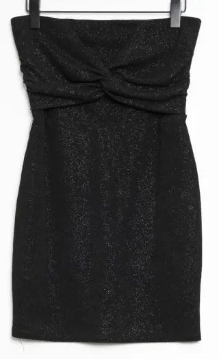 Conjunto de varias prendas de ropa. Vestido Pull&Bear satinado marfil asimétrico talla s Vestido Bershka negro palabra de honor glitter talla xs Mono corto Pull&Bear lunares marrón – Talla S Baqueros shorts denim Zara tiro alto desflecados