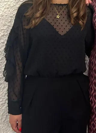 Mono elegante de color negro, con un diseño moderno y detalles únicos. - Tejido semitransparente con lunares. - Mangas abullonadas con volantes. - Escote con detalle de tirantes. - Cremallera en la espalda.