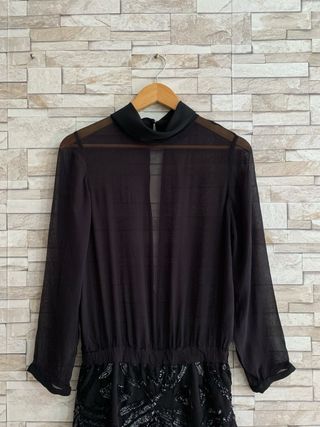 Mono de manga larga y pantalón short, transparente, y espalda abierta. El pantalón es de lentejuelas negras pero con forro interior. ideal para usar con un brasier debajo o una basica de tirante fino. Talla S