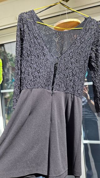 1 - vestido negro elegante encaje precioso elegante y llamativo sexy entallado queda espectacular puesto tiene cremallera en la espalda. talla S marca Zara precio 40€ ....... 2 - mono pantalón negro de flores hojas con muchos colores ajustadito al cuerpo a la cintura tiene la espalda al aire y un lacito que le cae tiene cremallera también en la parte del pantalón para mayor comodidad al ponerlo es muy bonito y sexy talla S 36 precio 18€