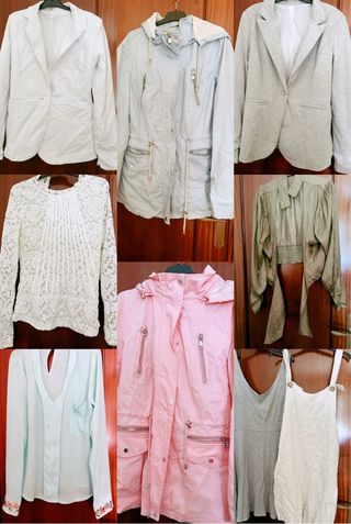 Conjunto de prendas de ropa para mujer, ideal para la temporada de primavera. Incluye varias piezas en tallas S y M. 9 prendas por 10€ - Chaqueta blanca - Chaqueta gris - Chaqueta rosa -Chaqueta azul - Blusa blanca de encaje - Blusa verde - Blusa celeste - Mono beige y vestido gris