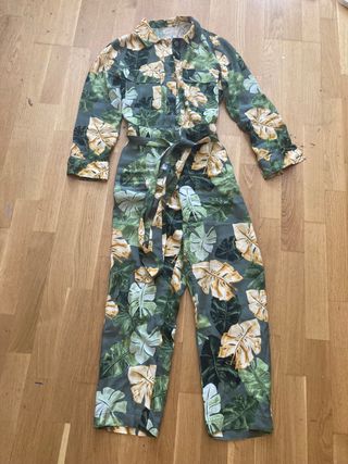 Mono largo de Zara con un pequeño enganchón en la parte trasera de la pernera derecha. Ideal para hacer corto, aunque no es difícil arreglar la tara. Tela tipo loneta elástica y fresca. Azul cielo. Queda entallado en cintura y es bastante ajustado. Aunque parezca más amplio, es una S, una 36, así que es ceñido r el tronco. Mira mi perfil. Descuentos por lotes y más.