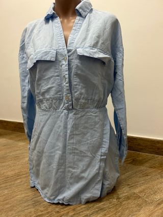 Vestido mono de manga corta en azul celeste de Zara en talla XS. Cierre trasero con cremallera. Nuevo con etiqueta. 53% algodón.