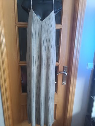 magnífico mono largo Marca Zara. Fluido y elástico. Color beige con pequeñas líneas azul marino. tirante fino. talla M. Totalmente nuevo.